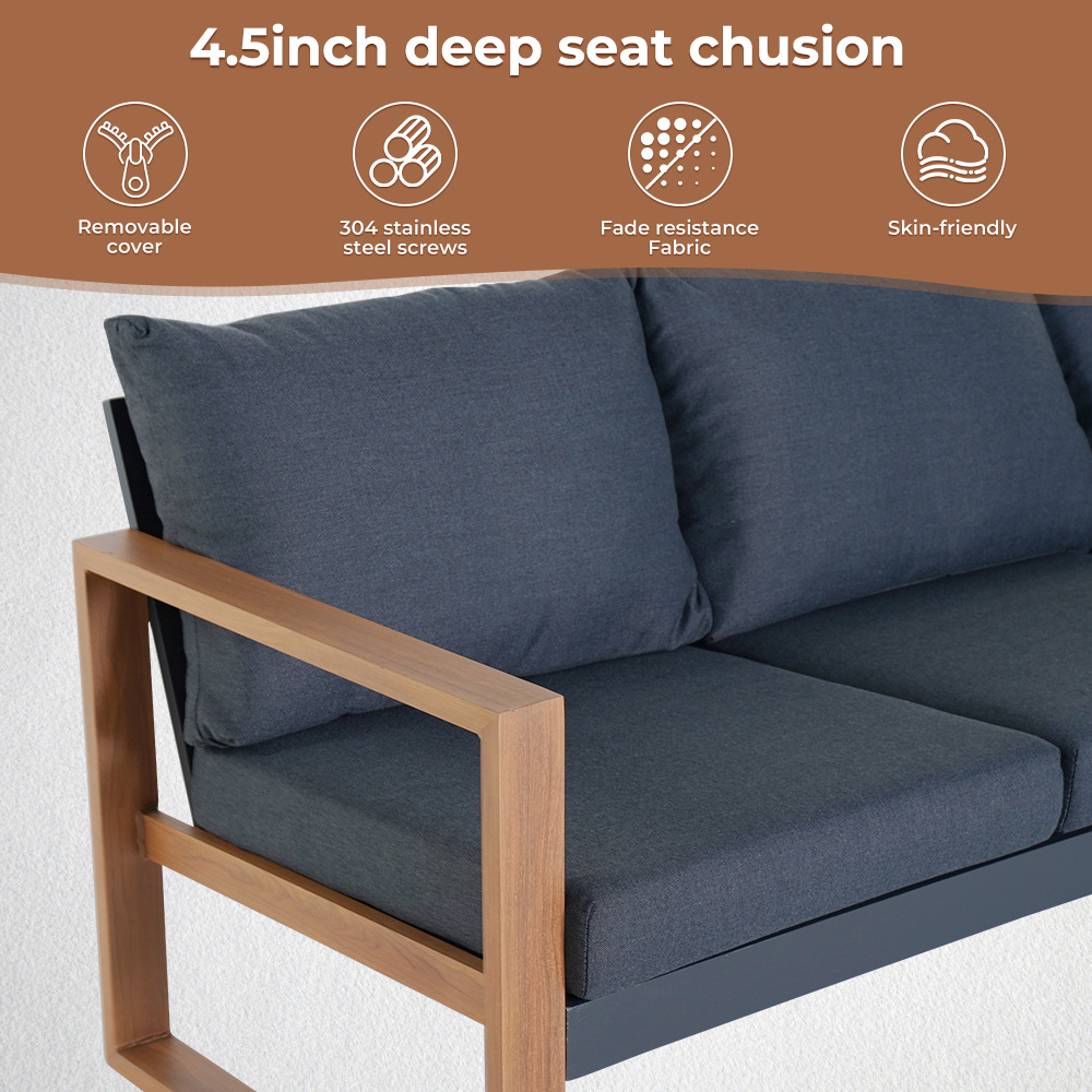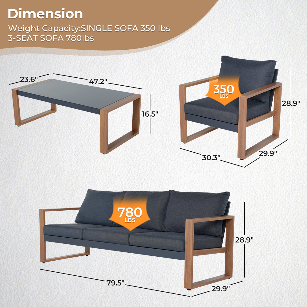 Dimensions & Weight: 3-person sofa: 79.5" W x 29.9" D x 28.9" H; Sofas: 30.3" W x 29.9" D x 28.9" H; table: 30.3" W x 29.9" D x 28.9" H.